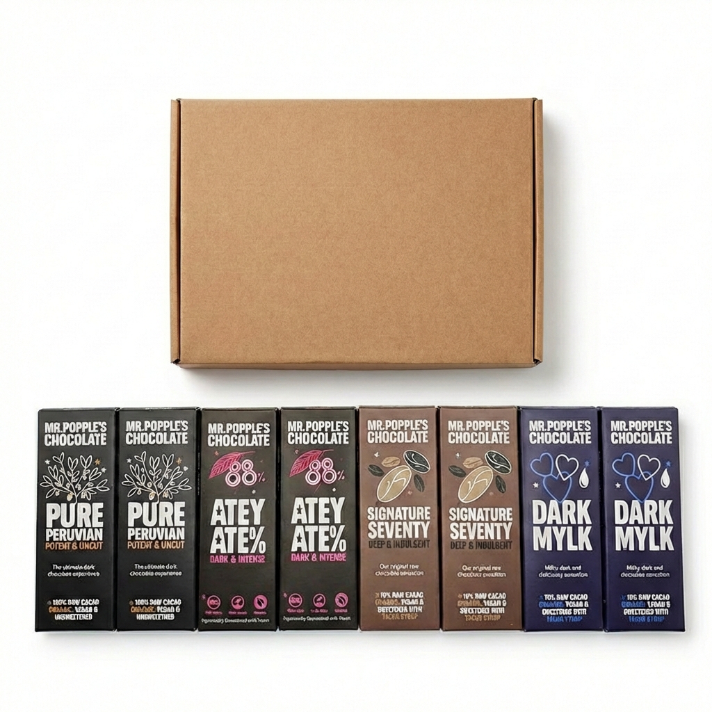 Eight bars that showcase the intense, complex flavours of our dark chocolate bars, all made from raw organic Peruvian Criollo cacao. Perfect for those who love their chocolate bold and unadulterated.